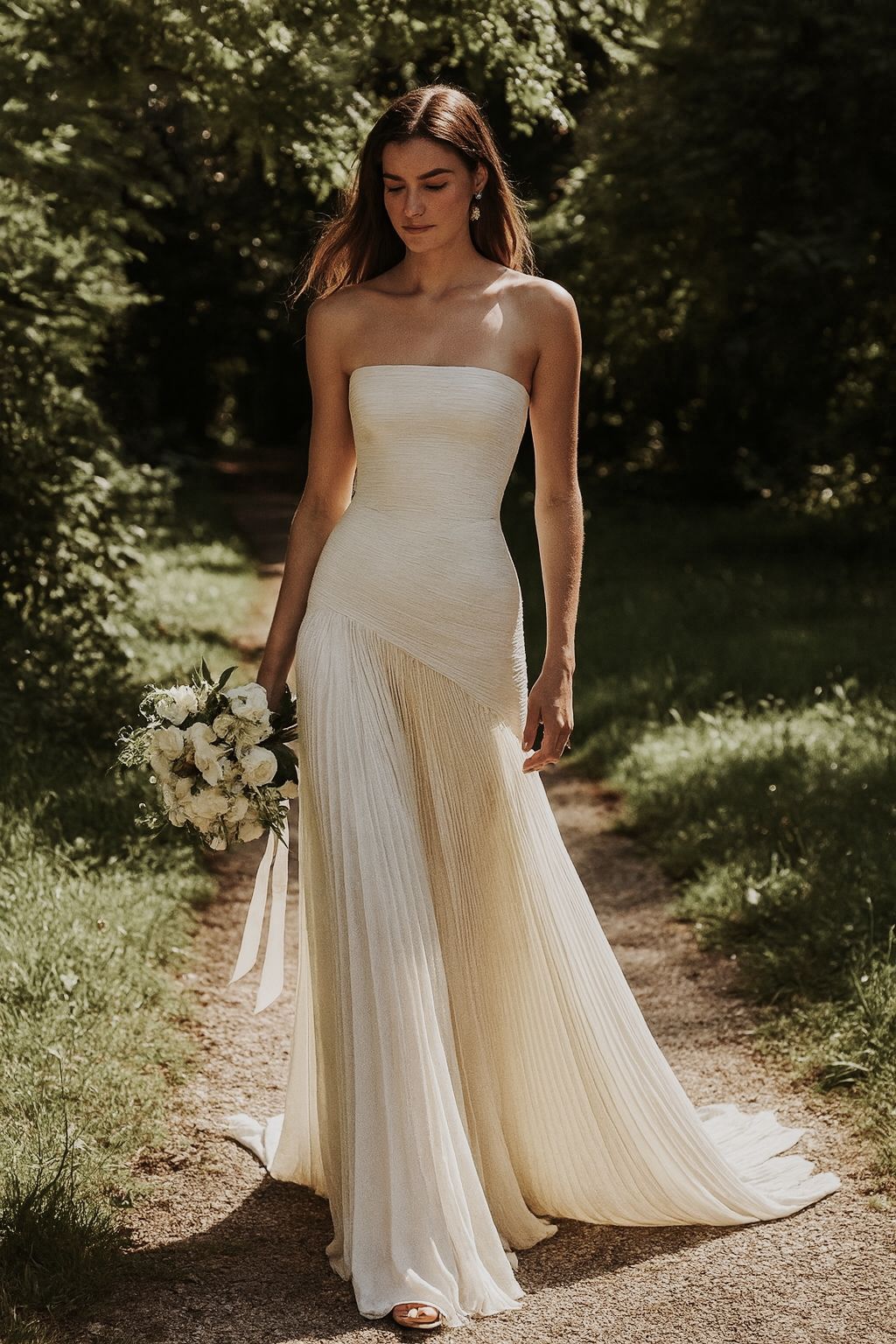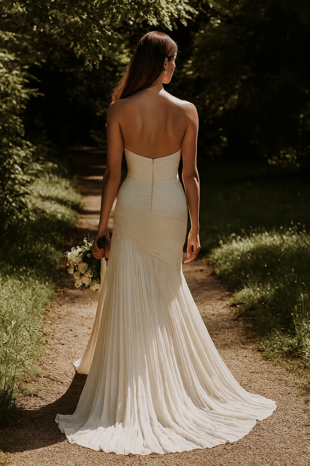 Introducing Alicia, where modern bridal minimalism meets unparalleled artistry. This exquisite gown is meticulously handcrafted in Chile from luxurious pleated silk-blend fabric, featuring a sculpted strapless bodice that gracefully embraces your silhouette and an asymmetrical draped waistline that flows into a softly pleated skirt. Each piece is created to order with exceptional craftsmanship over 8–12 weeks, ensuring every detail reflects our commitment to artisanal excellence. Effortlessly elegant, timelessly fluid, and designed for the discerning bride who values understated sophistication—Alicia embodies the perfect harmony of contemporary innovation and refined simplicity.