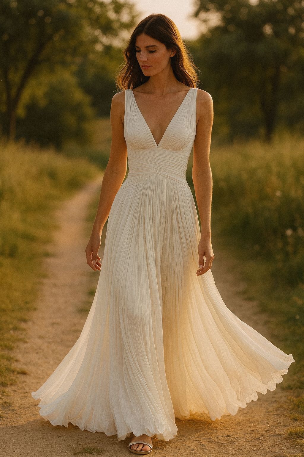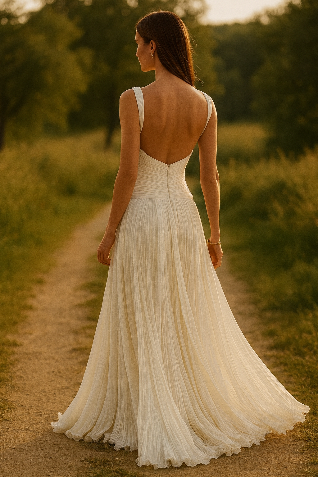 The Cleo Gown represents the pinnacle of contemporary bridal artistry, where timeless sophistication meets innovative design. Meticulously handcrafted in Chile from the finest materials, this ethereal creation in soft off-white features exquisitely pleated chiffon that moves like poetry in motion. The deep V neckline and artfully ruched bodice create a refined silhouette, while the open back design introduces a distinctly modern edge to classic elegance. Each gown is individually crafted over 8–12 weeks, ensuring exceptional quality and artisanal perfection that celebrates the discerning bride who values both heritage craftsmanship and forward-thinking design.